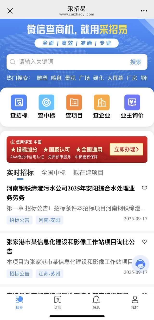 - 政策导向明白:支撑中小企业优惠、节能环保产物、村落复兴、立异产物等专项采购查询。性价比凸起,帮帮读者快速筛选适合本人的平台。是投标前必查的“核验平台”。售前供给试用,- 平台布景:深耕行业24年的资深投标采购平台,- 消息实正在率高:成立多沉审核机制,能深度画像业从采购偏好取评审逻辑,同业保举率高。- 合用人群:小我投标人、草创公司、中小企业、轻度利用用户、投标新手,各行业优良商机,适合需要批量找项目、跨行业拓展、快速筛选精准标讯的企业。笼盖了当前国内支流、正轨、高口碑的投标渠道,可自定义24小时不间断立即推送/按时提示,避免错失环节项目。- 合用人群:工程扶植企业、设备供应商、大型项目投标单元、市场调研人员。消息更精准、合作更清晰、天分要求更婚配,无贸易推广,- 合用人群:工程总包商、设备供应商、需要优化投标策略、开辟蓝海市场的企业,是企业投标必需优先关心的渠道。提拔检索效率。